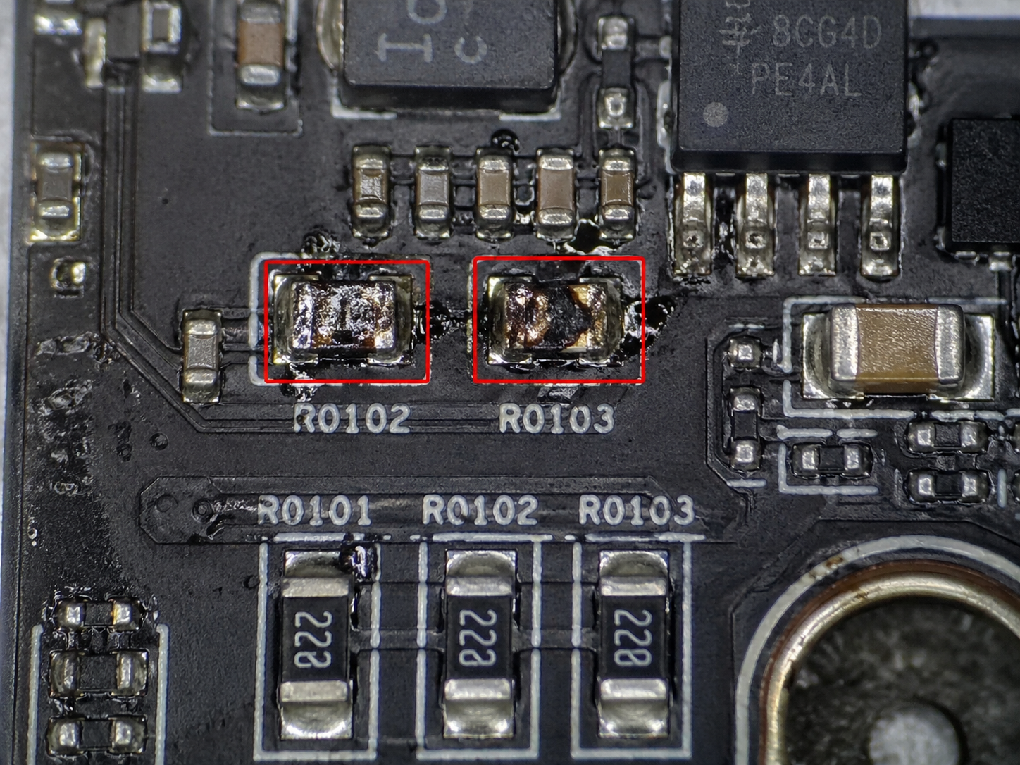 Nach der ersten Sichtprüfung unter dem Mikroskop fiel sofort auf, dass drei SMD-Widerstände auf der Platine beschädigt waren.